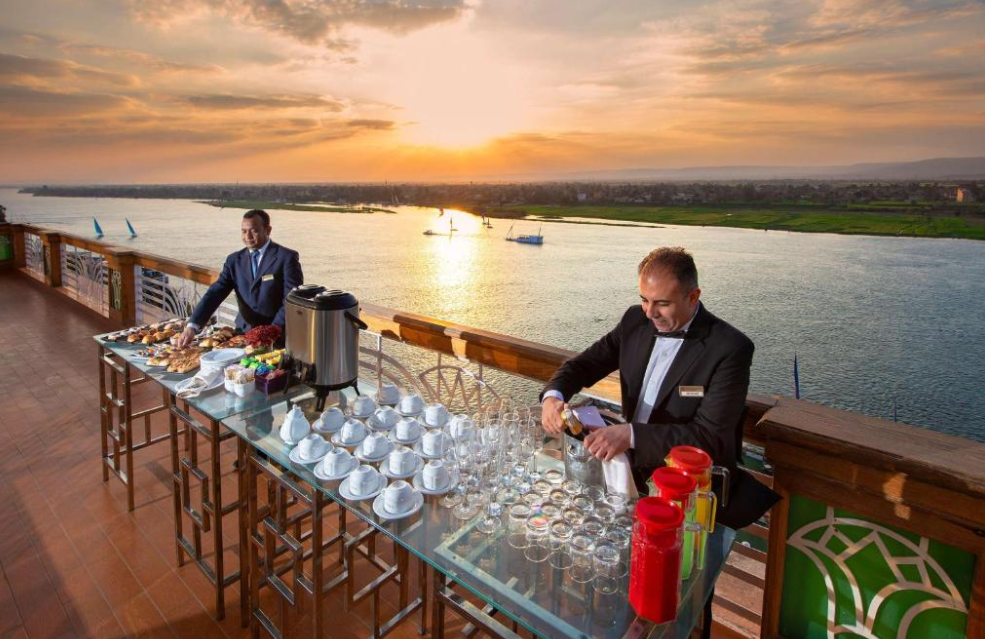 Dining at Sonesta St. George is a journey in itself. The Serapis Restaurant offers bountiful international buffets with both indoor and outdoor seating overlooking the river. For a more intimate culinary experience, Beban Italian Restaurant serves traditional Mediterranean dishes in a stylish, candlelit setting, while Miyako Japanese Restaurant presents elegant teppanyaki and sushi with Nile views. Throughout the day and into the night, the Lotus Café and Nobles Lounge provide relaxed, social spaces to enjoy fresh coffee, sweet pastries, or expertly mixed drinks. And for something truly memorable, the Nile Pontoon invites you to sip shisha or cocktails as the sun sets over the water.